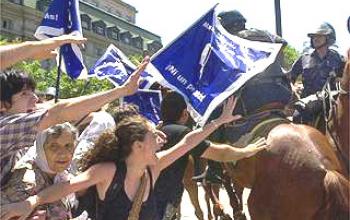 2. Le gouvernement des gangsters du président Duhalde, ses forces de sécurité et les bandes à sa solde sont les responsables de ce nouveau massacre. Mais en sont aussi responsables les gouvernements des États-Unis et de l’Union européenne, le FMI et ses fonctionnaires, qui viennent d’exiger la répression pour remettre de "l’ordre" dans le désordre néolibéral et le désastre social provoqué par leur propre politique économique. L’Argentine est "à vendre" et la mondialisation capitaliste - par le biais de ses entreprises et de ses banques transnationales - se dispute le partage du butin. Ne se satisfaisant pas des privatisations, de la flexibilité du travail, de la rétention de l’épargne, de la misère de la moitié de la population, de la dette extérieure frauduleuse, ils veulent plus encore. Ils veulent l’expropriation totale des richesses, des revenus et des droits populaires acquis.